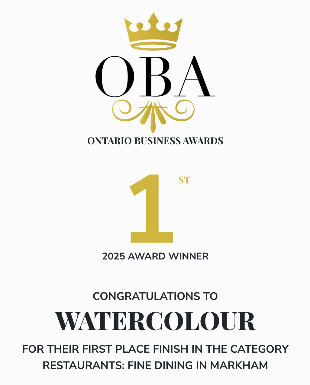 We are proud to share that Watercolour Restaurant has been honoured with the Ontario Business Award for Best Fine Dining Restaurant In Markham. A special thanks to our staff whose commitment to excellence creates the exceptional dining experience our guests enjoy every day. We are equally grateful to our valued clients and community for your continued trust and support.